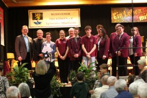 Nach einer kurzen Umbaupause startete der Musikverein Konken unter der Leitung seines Dirigenten Moritz Guth. Auf die Gäste wartete ein abwechslungsreiches und schwungvolles Programm, welches das Motto „Ein Leben mit Musik“ widerspiegelte. Den Auftakt machten die Westricher Musikanten mit dem Marsch „Kaiserin Sissi“. Der von Thiemo Kraas komponierte Titel „Imagasy“ besaß einen hohen Unterhaltungswert für das Publikum und konnte zusätzlich die Musikerinnen und Musiker animieren, in Grenzbereiche vorzudringen, wie sie in der Blasmusik nicht unbedingt üblich sind. Bei der Heimwerker-Polka überzeugten die Hobby-Heimwerker Yannik Jaqui und Nico Trumm mit ihrem handwerklichen Geschick und bauten während der Polka mit Säge und Hammer einen Stuhl auf der Bühne zusammen. Highlight des Konzertes war zweifelsohne der Titel „Celtic Flutes“, ein Solo-Stück für zwei Querflöten, exzellent dargeboten von Manuela Klein und Ina Martini.